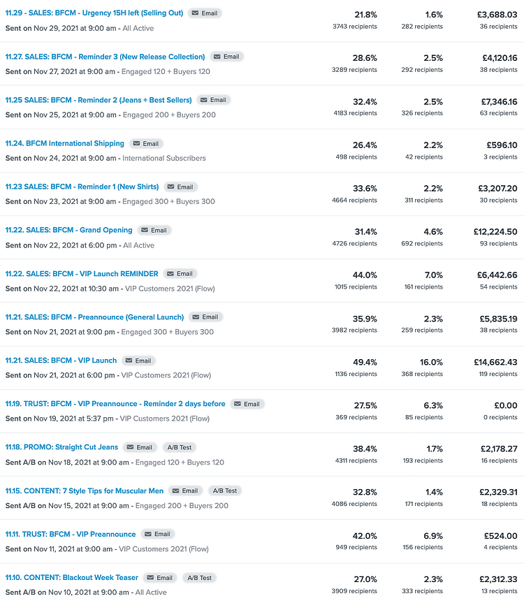 We implemented a strategy of sending out 14 emails in November, with 12 of them directly related to Black Friday. By using announcements, reminders, and urgent emails, we were able to effectively communicate with our client's customers. Additionally, we used BFCM as an opportunity to promote new product releases, which proved to be very successful. Outside of the Black Friday context, we typically send out 12 email campaigns per month. Before working with us, the client only sent out around 4-8 campaign emails per month, which was detrimental to their open rates and customer engagement. However, our consistent approach to email marketing has proven to be successful, as demonstrated by the revenue generated in the first 90 days of working together.